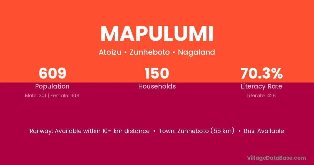 Zunheboto (55 km) is the nearest town to Mapulumi village for major economic activities and is located approximately 55 km away.