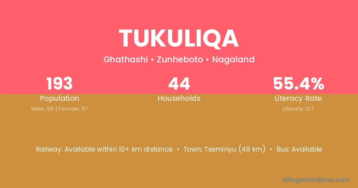 Tukuliqa village has a total population of 193 people, of which 96 are males and 97 are females.