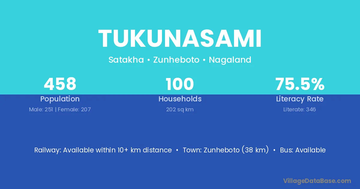 Zunheboto (38 km) is the nearest town to Tukunasami village for major economic activities and is located approximately 38 km away.