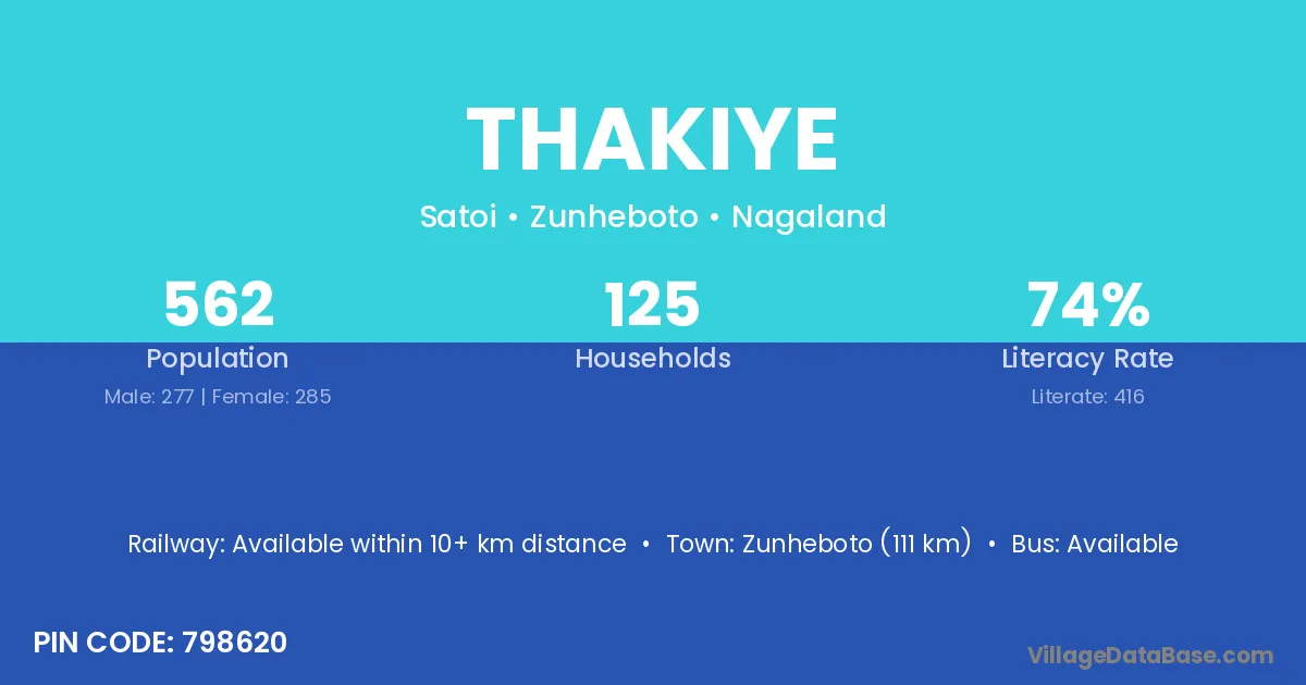 Zunheboto (111 km) is the nearest town to Thakiye village for major economic activities and is located approximately 111 km away.