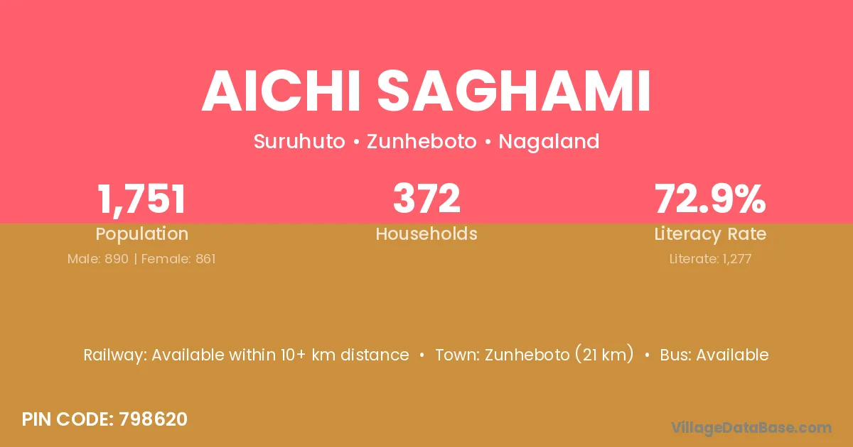 Zunheboto (21 km) is the nearest town to Aichi Saghami village for major economic activities and is located approximately 21 km away.