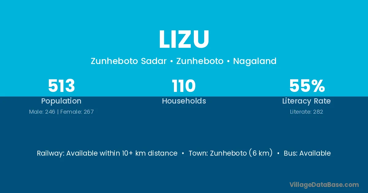 Zunheboto (6 km) is the nearest town to Lizu village for major economic activities and is located approximately 6 km away.