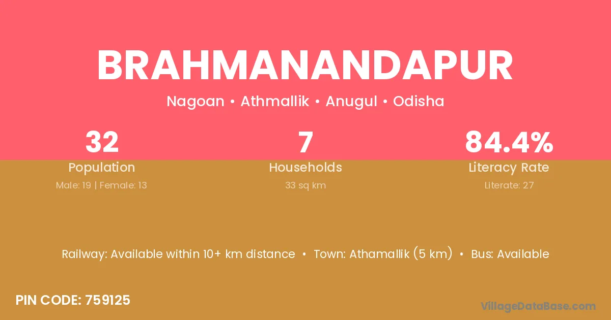 Athamallik (5 km) is the nearest town to Brahmanandapur village for major economic activities and is located approximately 5 km away.