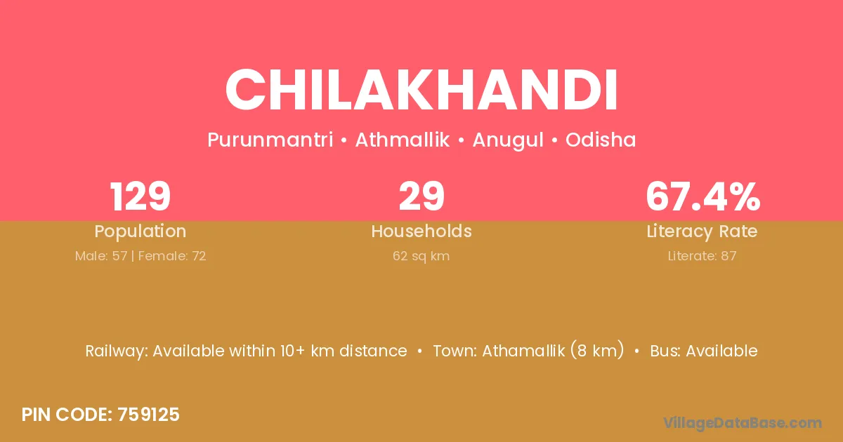Athamallik (8 km) is the nearest town to Chilakhandi village for major economic activities and is located approximately 8 km away.