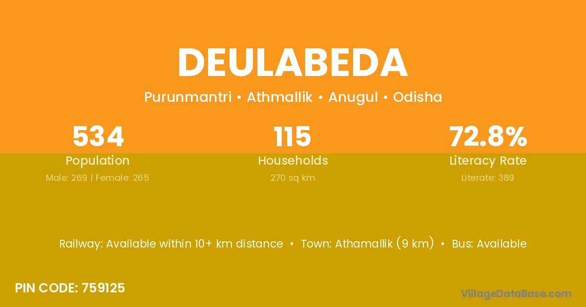 Athamallik (9 km) is the nearest town to Deulabeda village for major economic activities and is located approximately 9 km away.