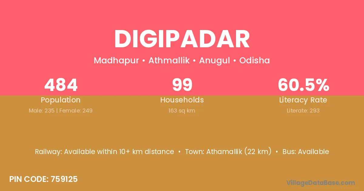 Athamallik (22 km) is the nearest town to Digipadar village for major economic activities and is located approximately 22 km away.