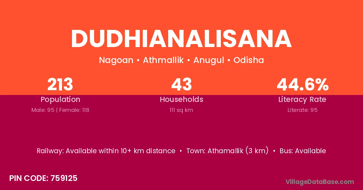 Athamallik (3 km) is the nearest town to Dudhianalisana village for major economic activities and is located approximately 3 km away.