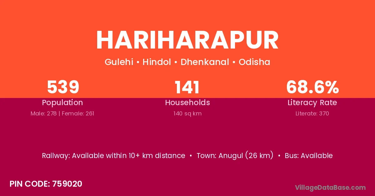 Athamallik (7 km) is the nearest town to Hariharapur village for major economic activities and is located approximately 7 km away.
