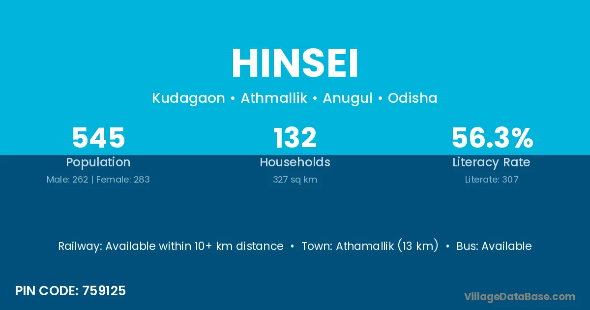 Athamallik (13 km) is the nearest town to Hinsei village for major economic activities and is located approximately 13 km away.