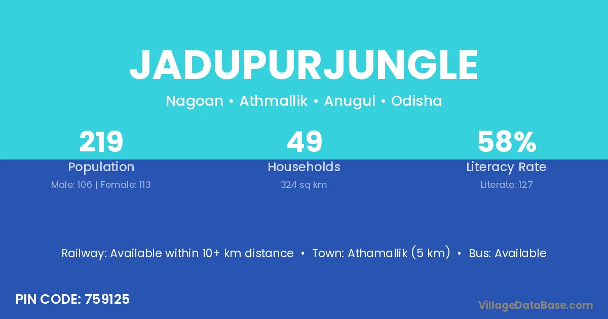 Athamallik (5 km) is the nearest town to Jadupurjungle village for major economic activities and is located approximately 5 km away.