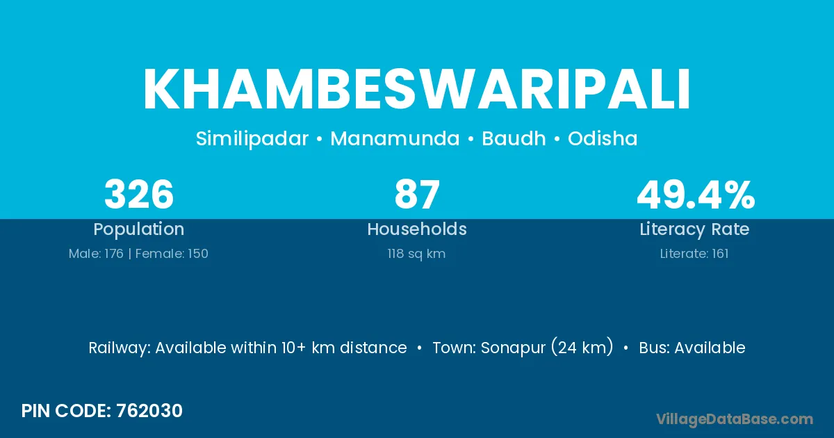Khambeswaripali village has a total population of 178 people, of which 85 are males and 93 are females.