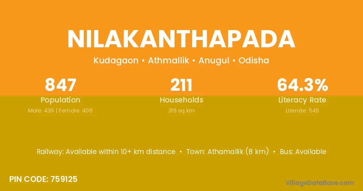 Athamallik (8 km) is the nearest town to Nilakanthapada village for major economic activities and is located approximately 8 km away.