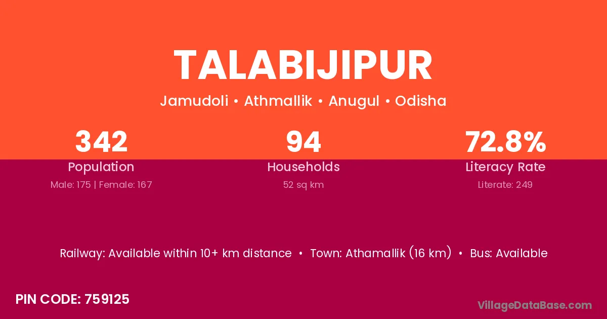 Athamallik (16 km) is the nearest town to Talabijipur village for major economic activities and is located approximately 16 km away.