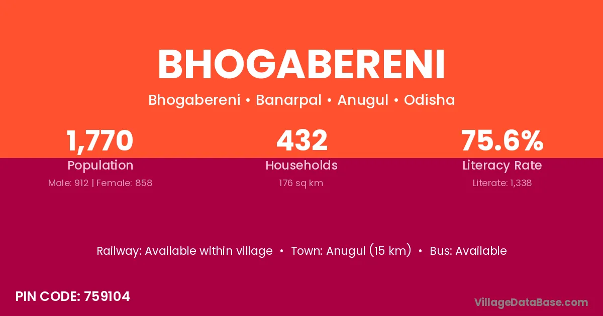Bhogabereni village has a total population of 1,770 people, of which 912 are males and 858 are females.