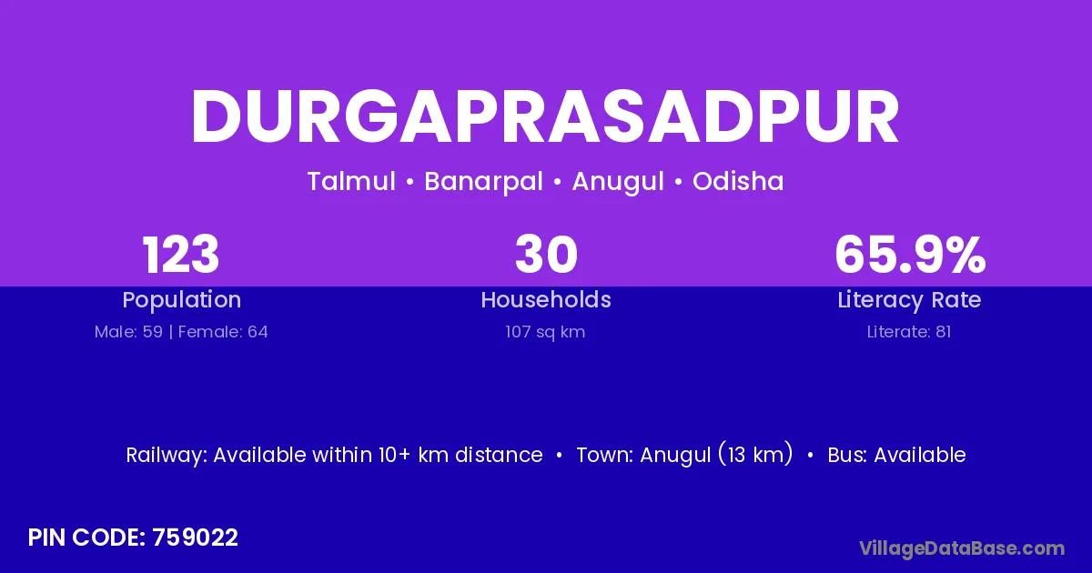 Anugul (13 km) is the nearest town to Durgaprasadpur village for major economic activities and is located approximately 13 km away.