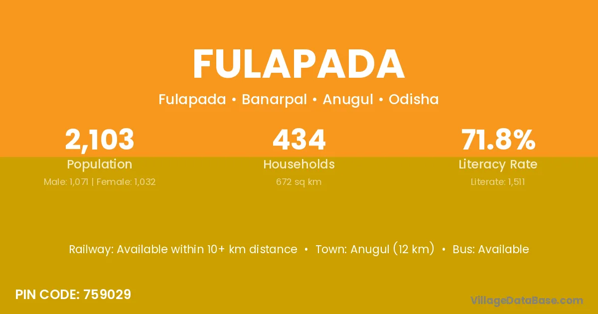 Anugul (12 km) is the nearest town to Fulapada village for major economic activities and is located approximately 12 km away.
