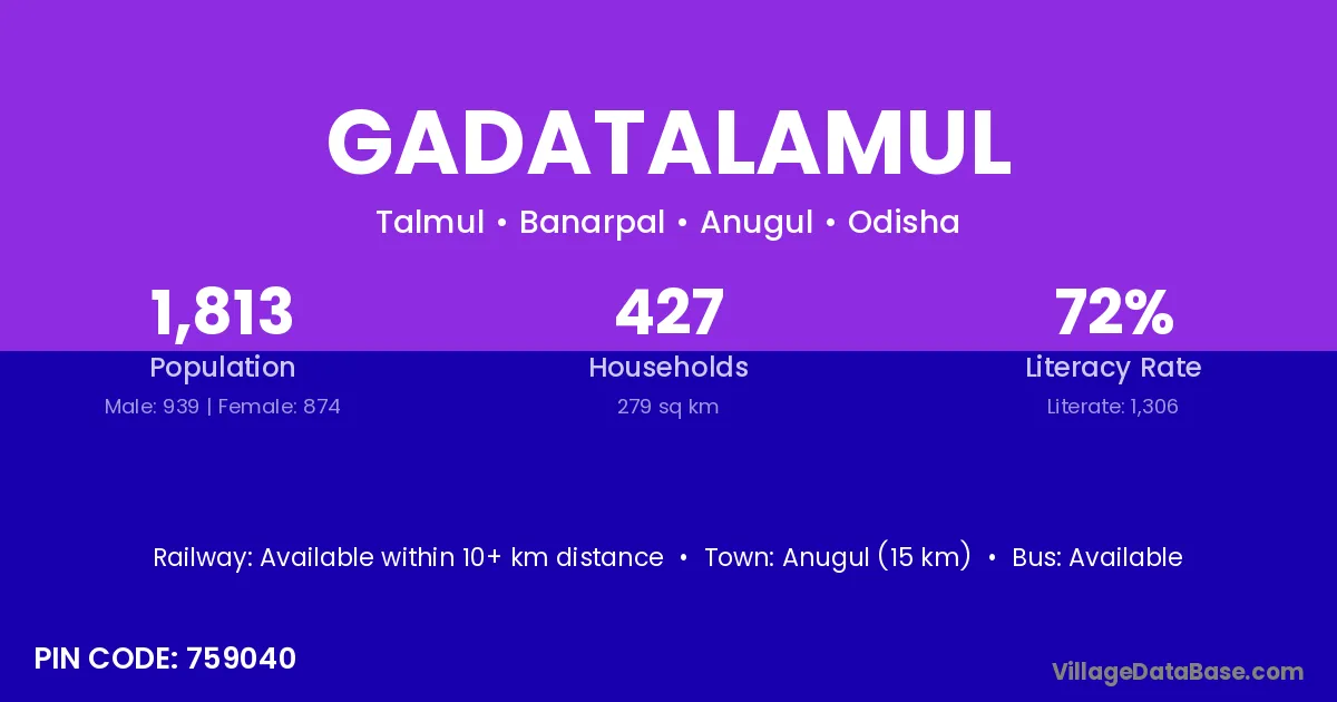 Anugul (15 km) is the nearest town to Gadatalamul village for major economic activities and is located approximately 15 km away.
