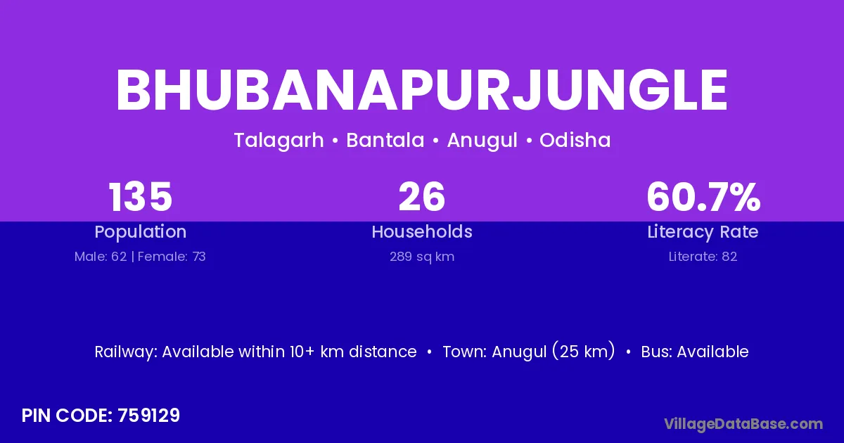 Bhubanapurjungle village has a total population of 135 people, of which 62 are males and 73 are females.