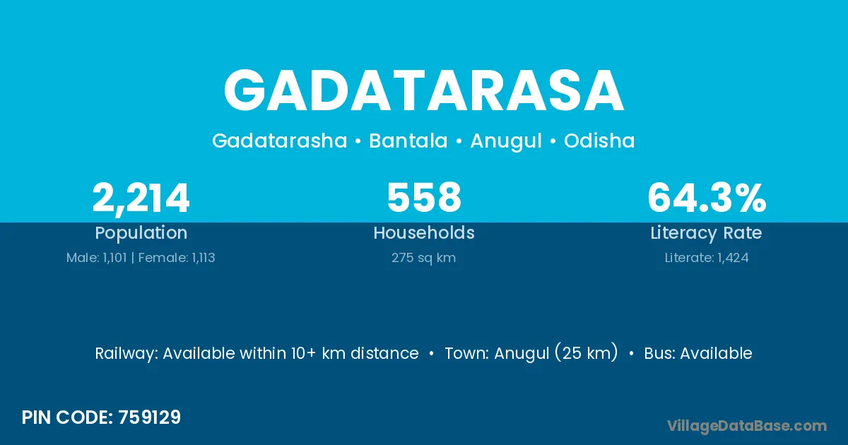 Anugul (25 km) is the nearest town to Gadatarasa village for major economic activities and is located approximately 25 km away.