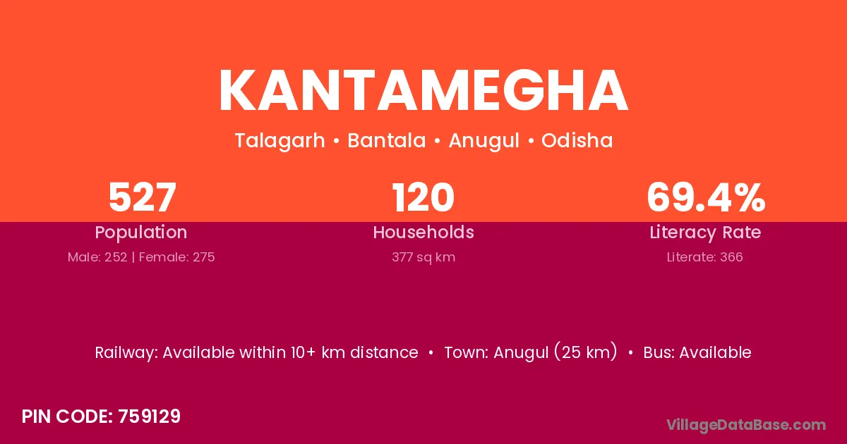 Anugul (25 km) is the nearest town to Kantamegha village for major economic activities and is located approximately 25 km away.