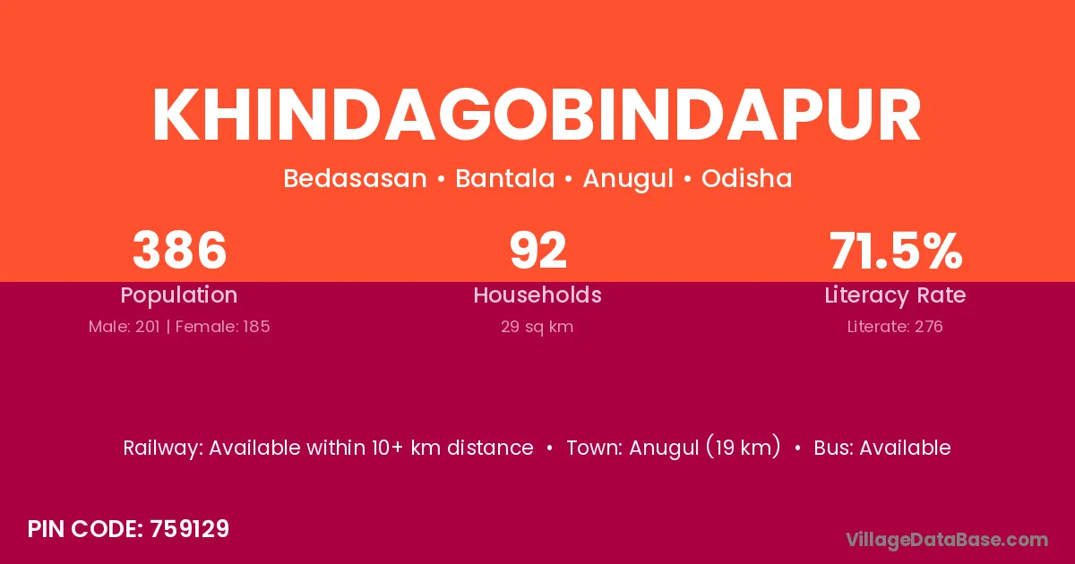 Anugul (19 km) is the nearest town to Khindagobindapur village for major economic activities and is located approximately 19 km away.