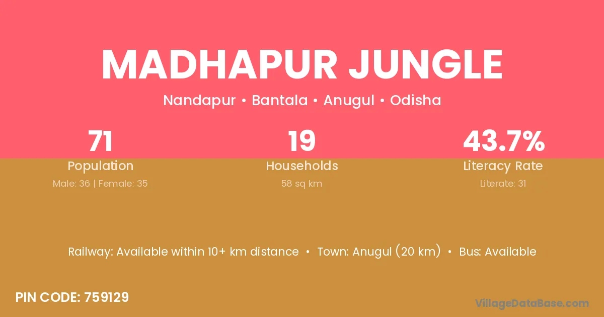 Anugul (20 km) is the nearest town to Madhapur Jungle village for major economic activities and is located approximately 20 km away.