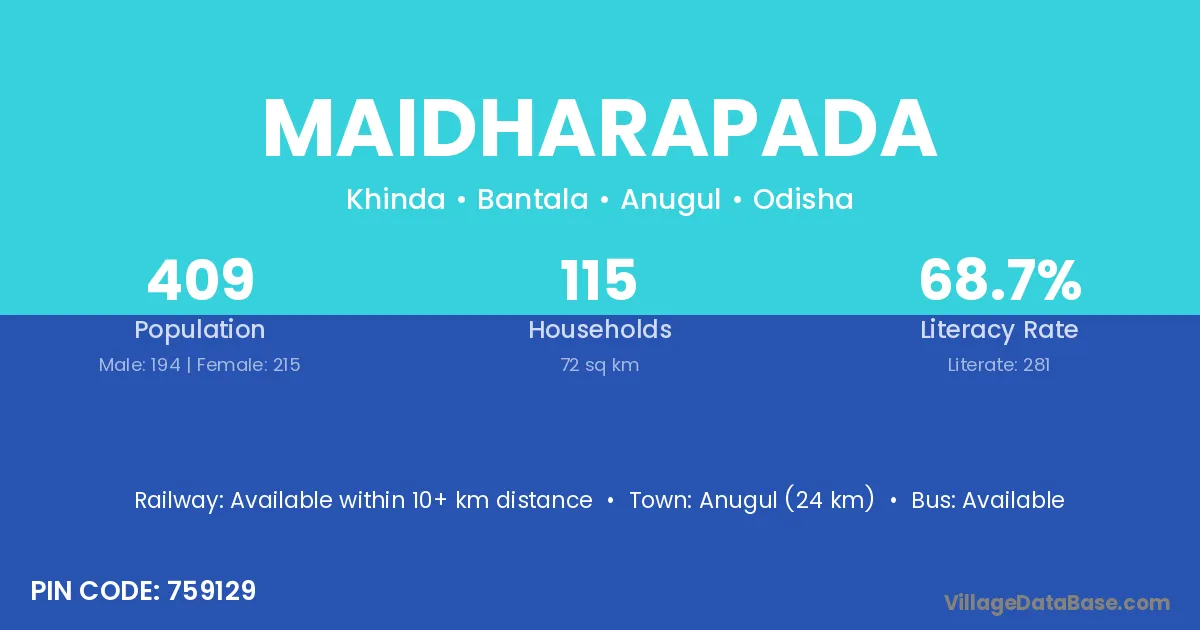 Anugul (24 km) is the nearest town to Maidharapada village for major economic activities and is located approximately 24 km away.