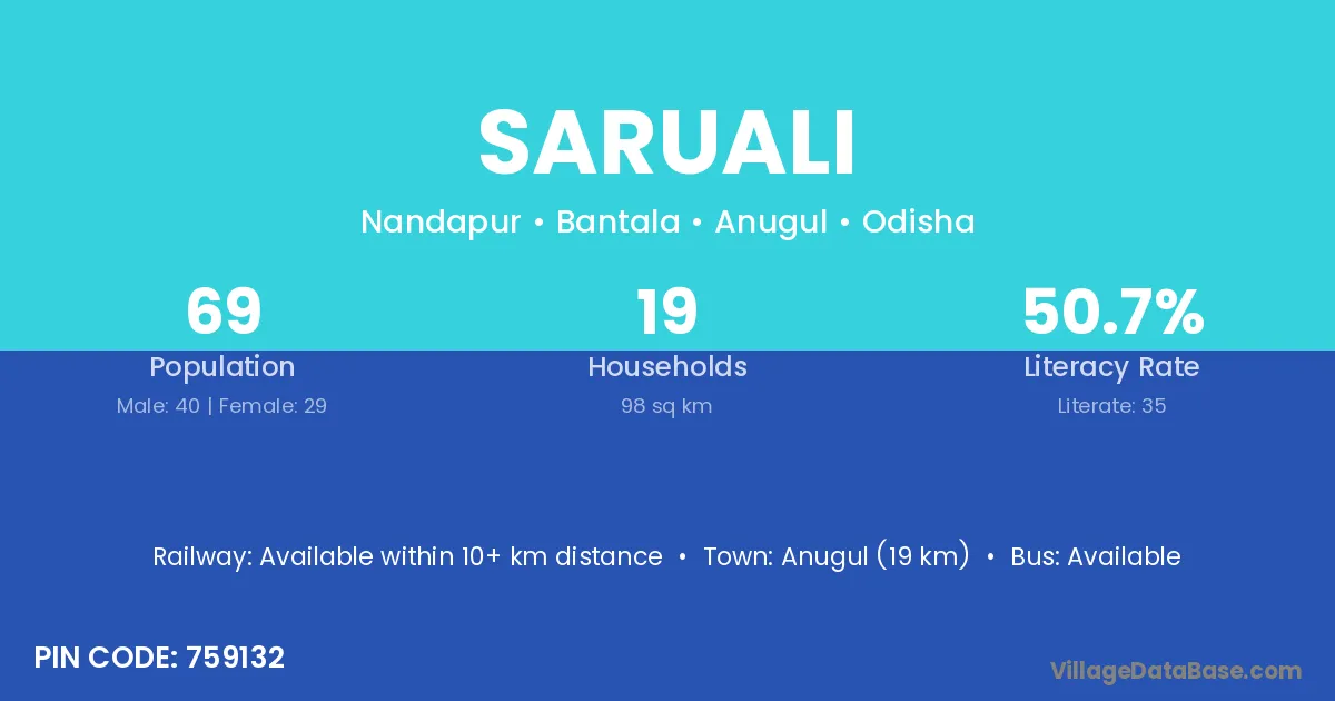 Anugul (19 km) is the nearest town to Saruali village for major economic activities and is located approximately 19 km away.