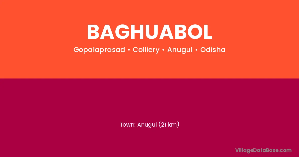 Anugul (60 km) is the nearest town to Baghuabol village for major economic activities and is located approximately 60 km away.