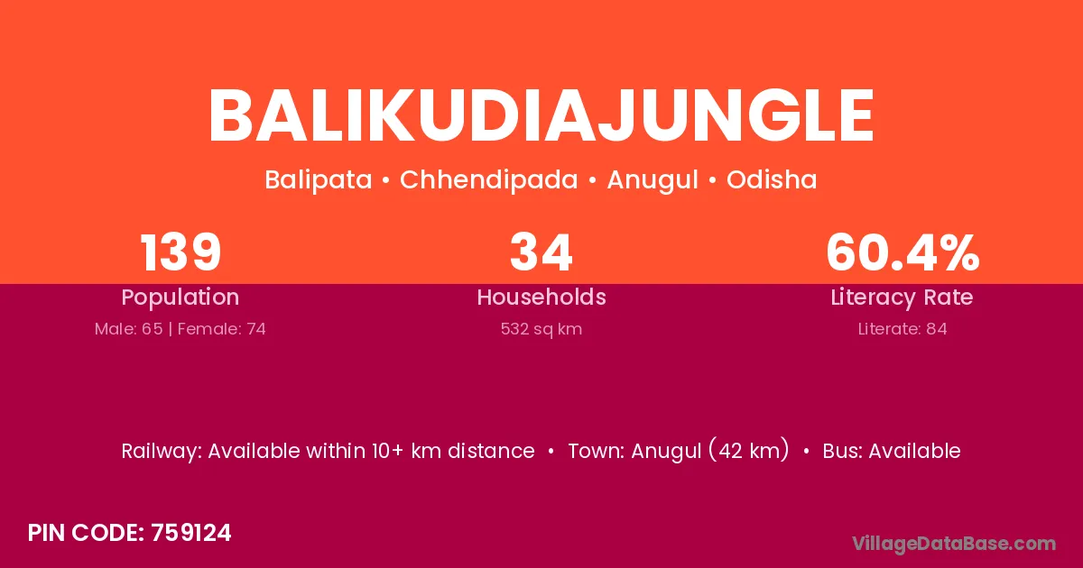 Anugul (42 km) is the nearest town to Balikudiajungle village for major economic activities and is located approximately 42 km away.