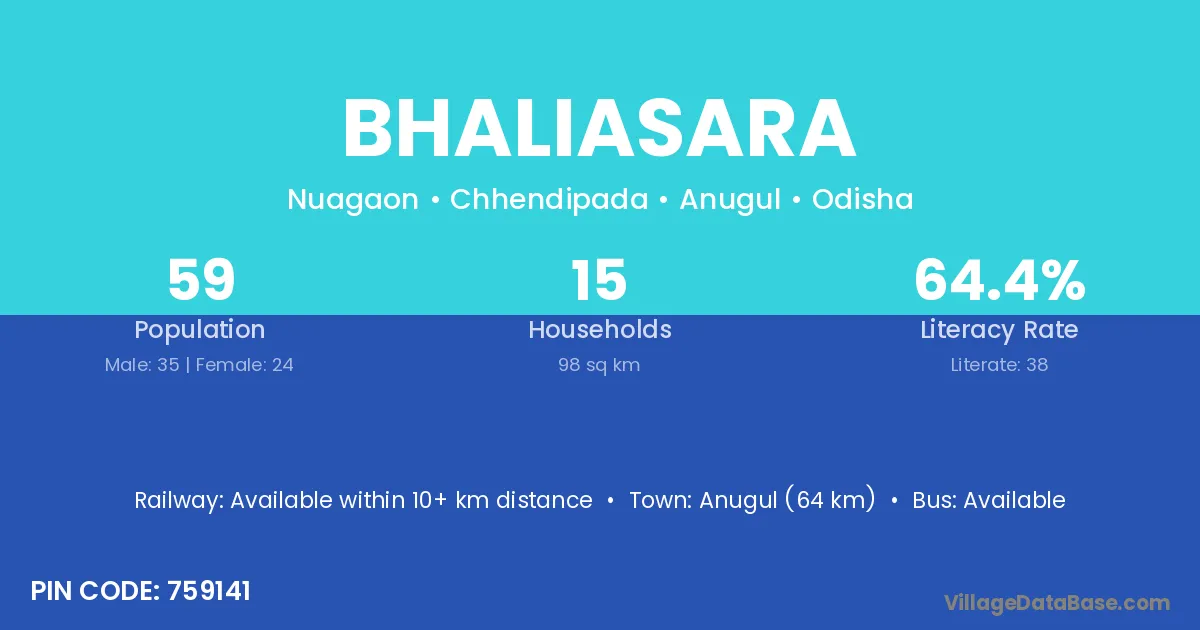Anugul (64 km) is the nearest town to Bhaliasara village for major economic activities and is located approximately 64 km away.