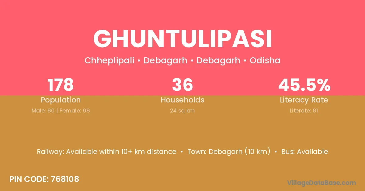 Anugul (55 km) is the nearest town to Ghuntulipasi village for major economic activities and is located approximately 55 km away.