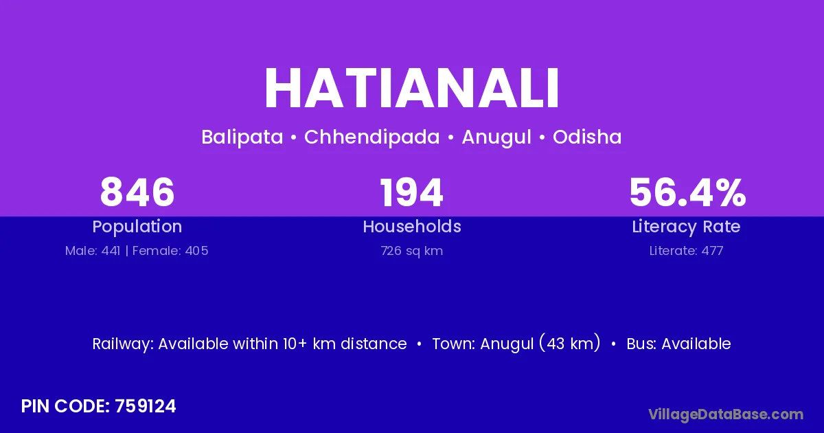 Anugul (43 km) is the nearest town to Hatianali village for major economic activities and is located approximately 43 km away.