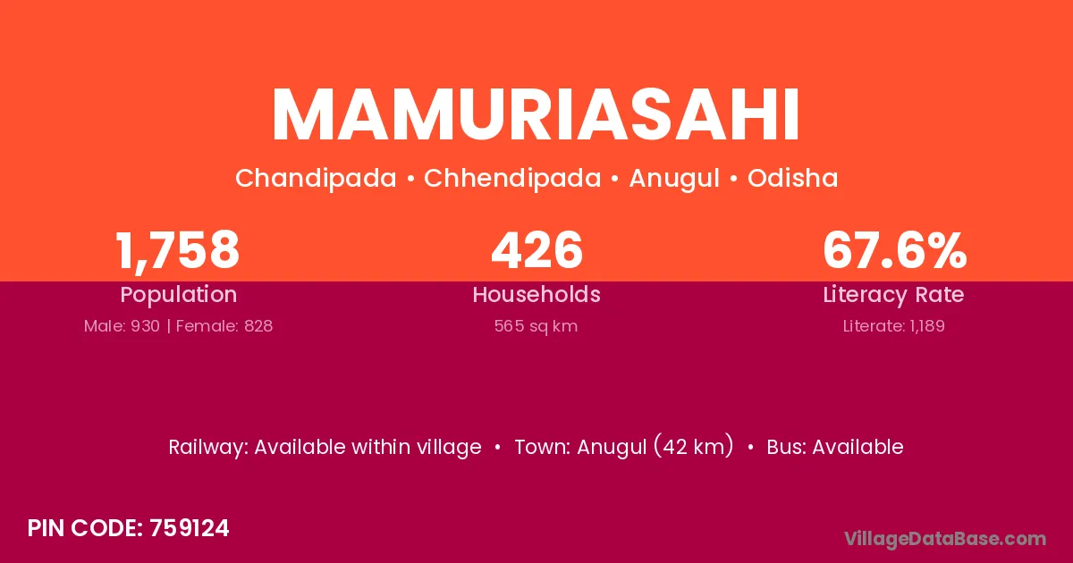 Anugul (42 km) is the nearest town to Mamuriasahi village for major economic activities and is located approximately 42 km away.