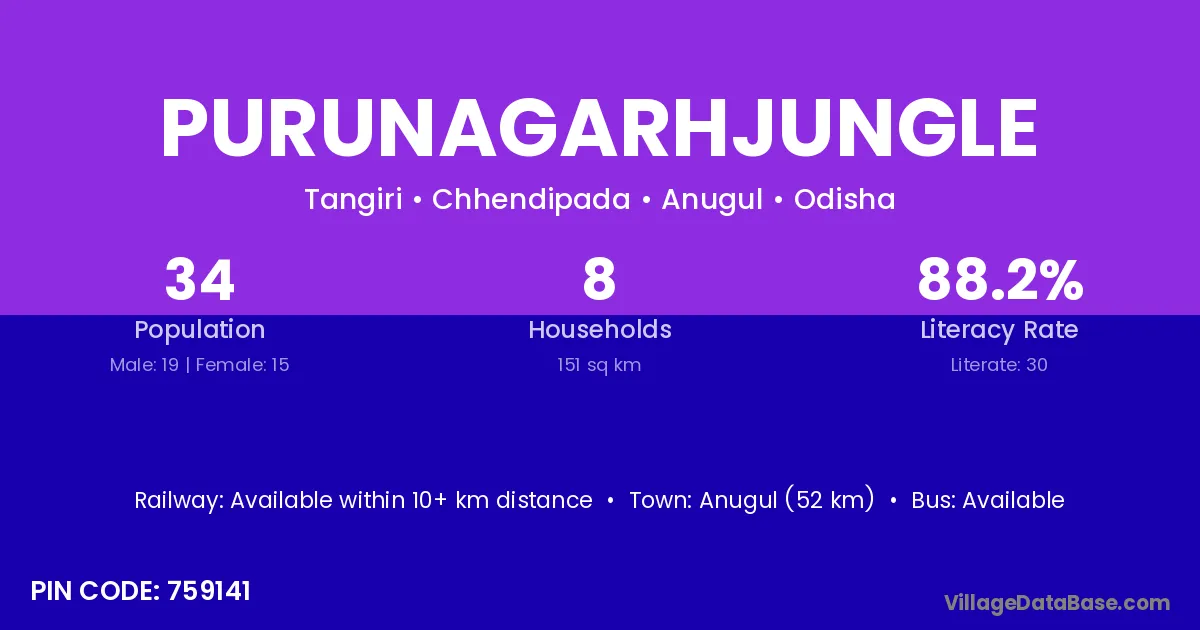 Anugul (52 km) is the nearest town to Purunagarhjungle village for major economic activities and is located approximately 52 km away.