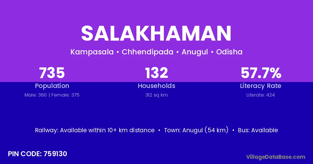 Anugul (54 km) is the nearest town to Salakhaman village for major economic activities and is located approximately 54 km away.