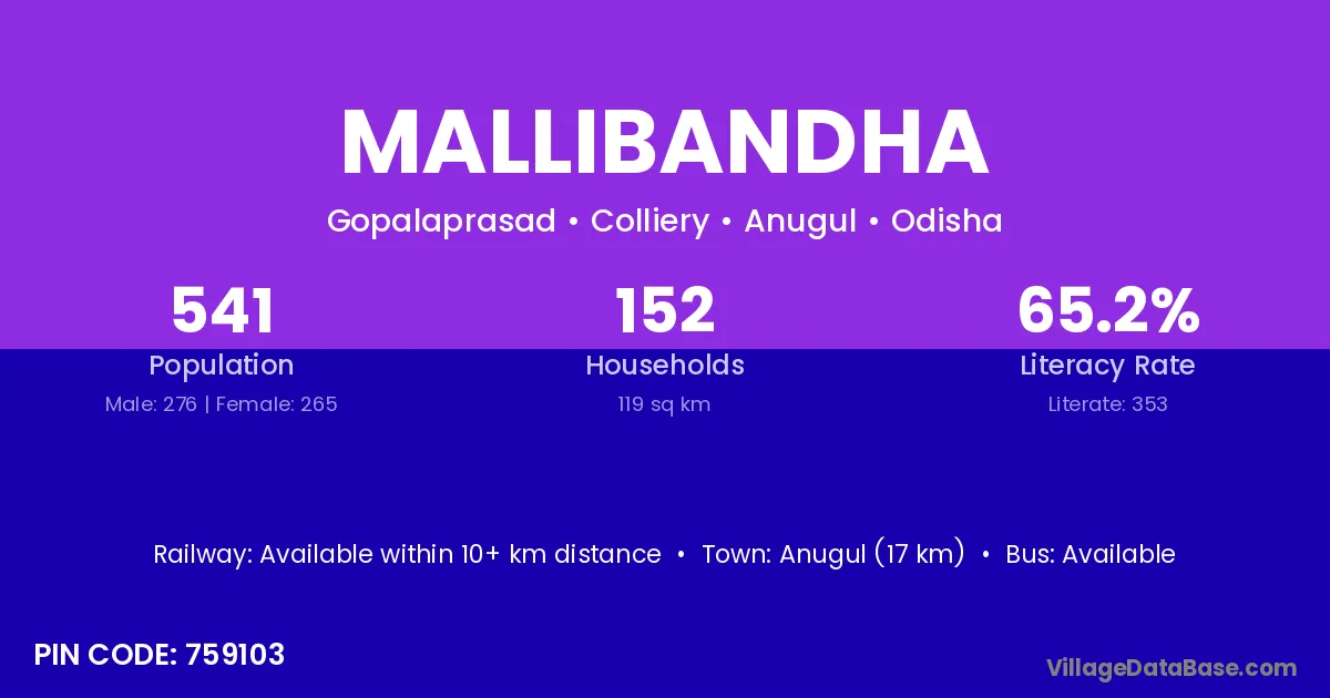 Mallibandha village has a total population of 541 people, of which 276 are males and 265 are females.