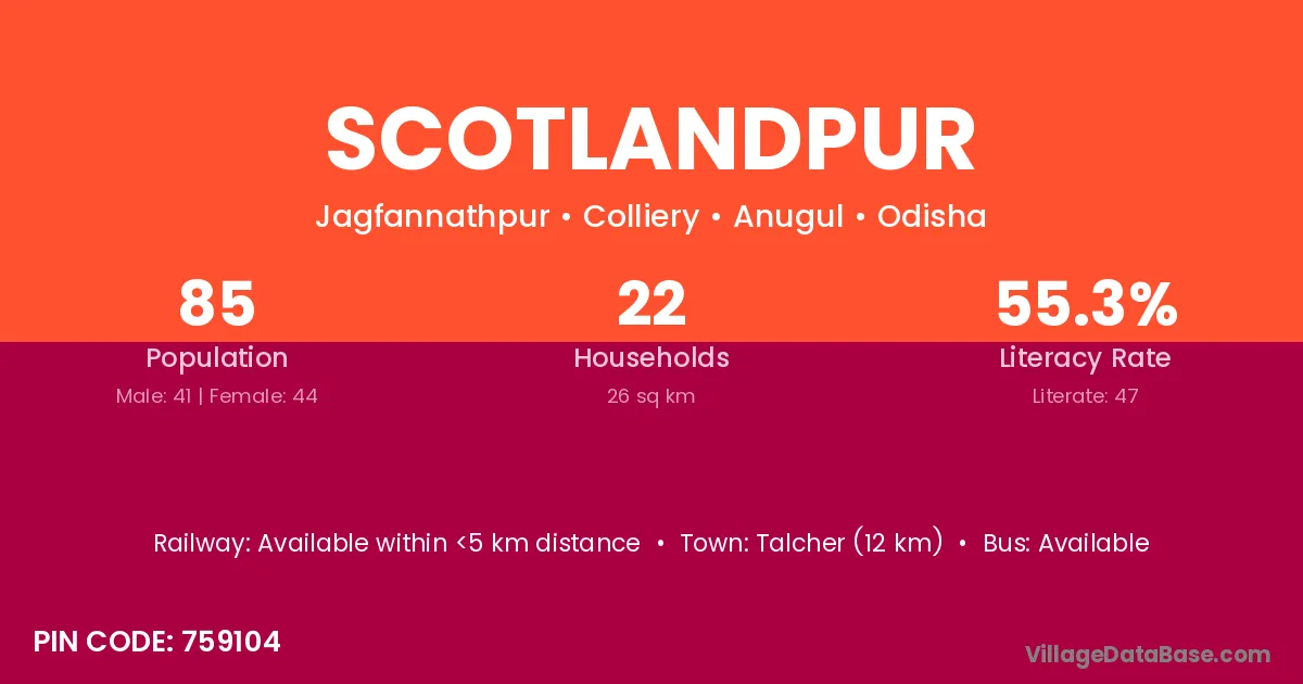 Talcher (12 km) is the nearest town to Scotlandpur village for major economic activities and is located approximately 12 km away.