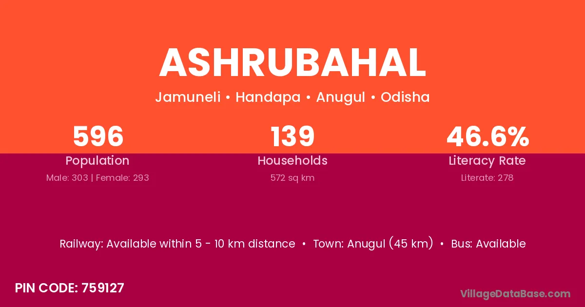 Anugul (45 km) is the nearest town to Ashrubahal village for major economic activities and is located approximately 45 km away.