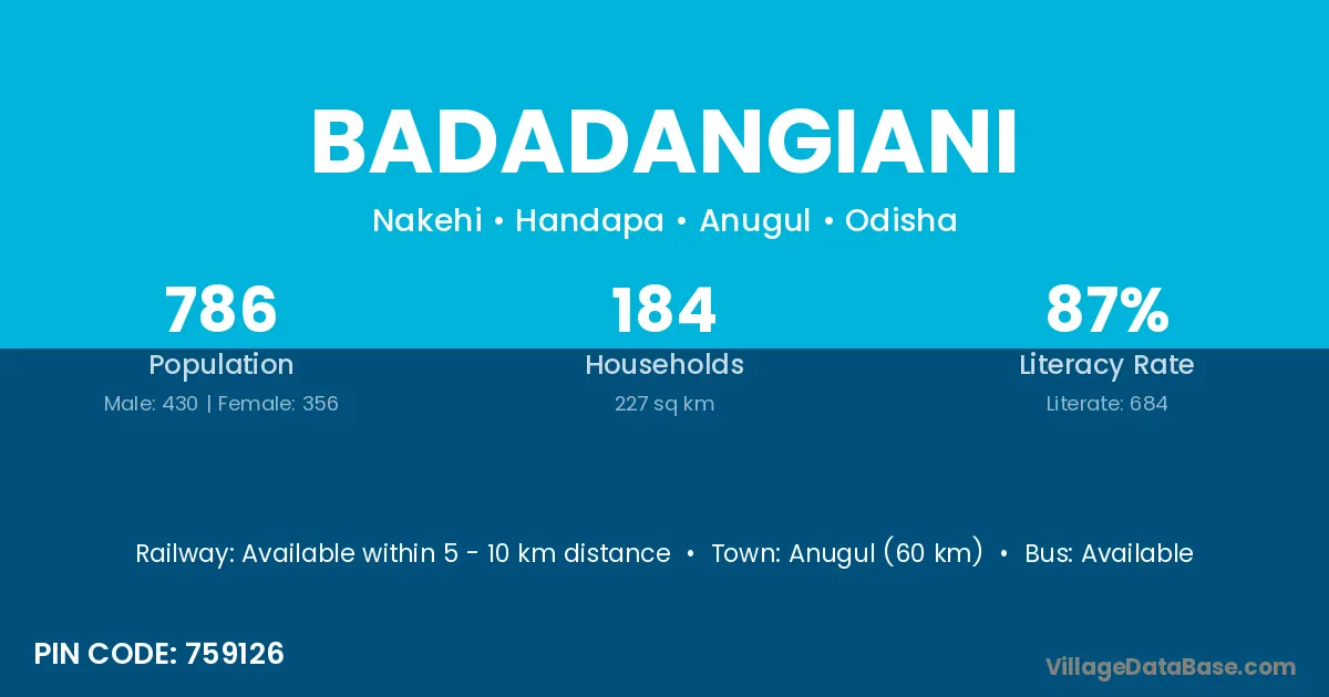 Anugul (60 km) is the nearest town to Badadangiani village for major economic activities and is located approximately 60 km away.