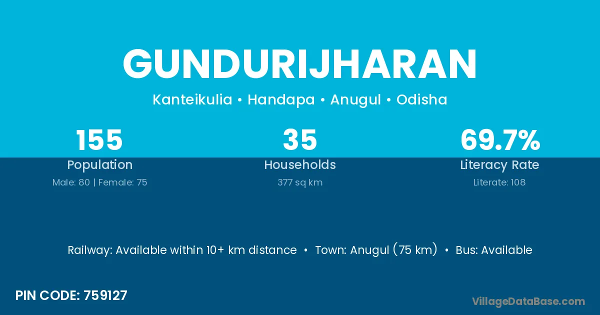 Anugul (75 km) is the nearest town to Gundurijharan village for major economic activities and is located approximately 75 km away.