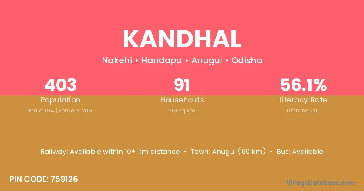 Anugul (60 km) is the nearest town to Kandhal village for major economic activities and is located approximately 60 km away.
