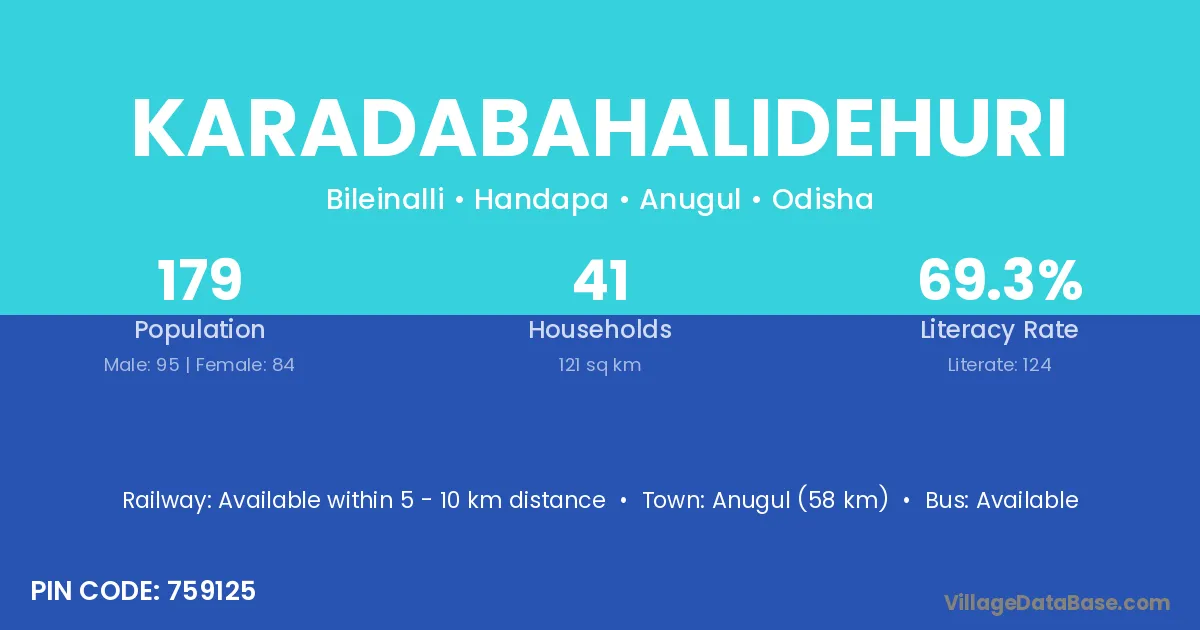 Anugul (58 km) is the nearest town to Karadabahalidehuri village for major economic activities and is located approximately 58 km away.