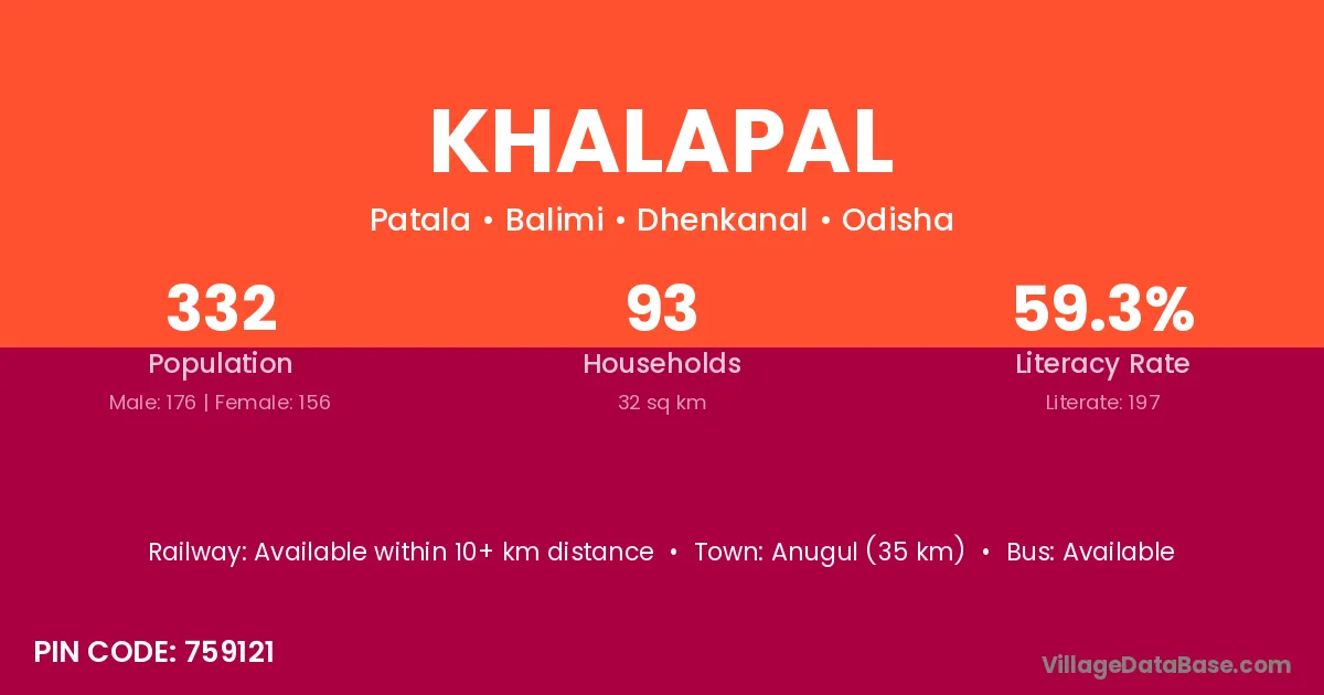 Anugul (63 km) is the nearest town to Khalapal village for major economic activities and is located approximately 63 km away.