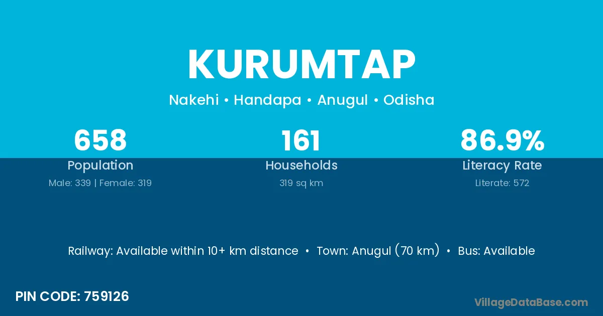 Anugul (70 km) is the nearest town to Kurumtap village for major economic activities and is located approximately 70 km away.