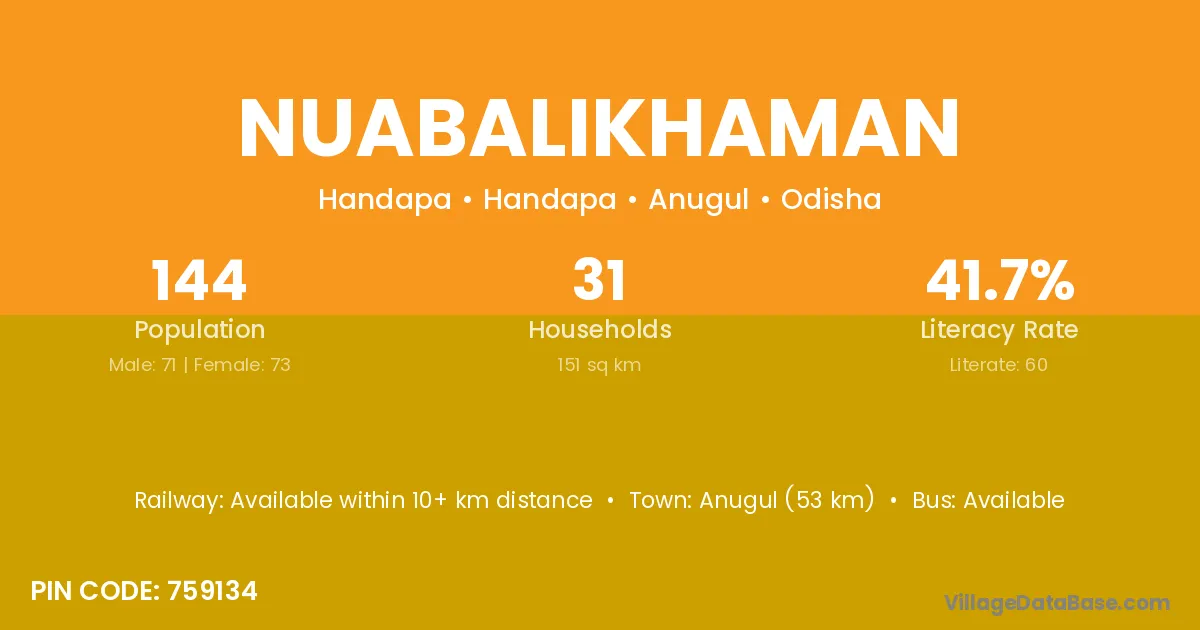 Anugul (53 km) is the nearest town to Nuabalikhaman village for major economic activities and is located approximately 53 km away.