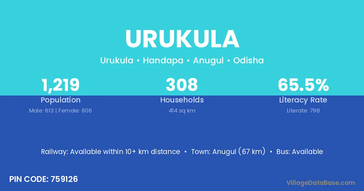 Anugul (67 km) is the nearest town to Urukula village for major economic activities and is located approximately 67 km away.