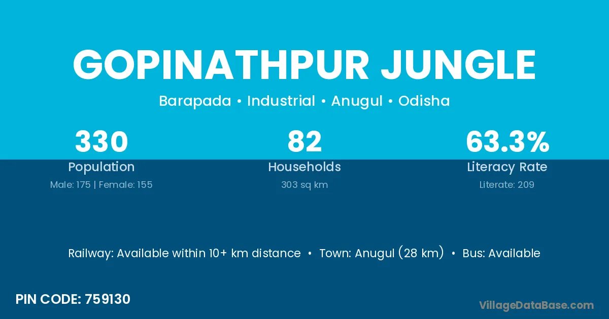Anugul (28 km) is the nearest town to Gopinathpur Jungle village for major economic activities and is located approximately 28 km away.