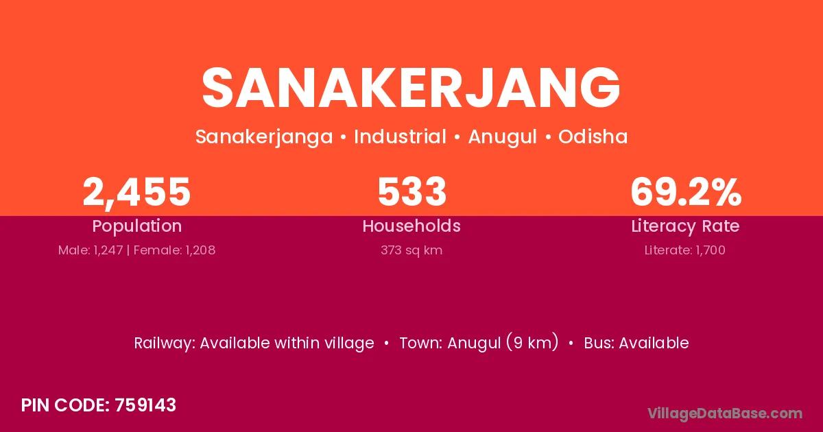 Anugul (9 km) is the nearest town to Sanakerjang village for major economic activities and is located approximately 9 km away.