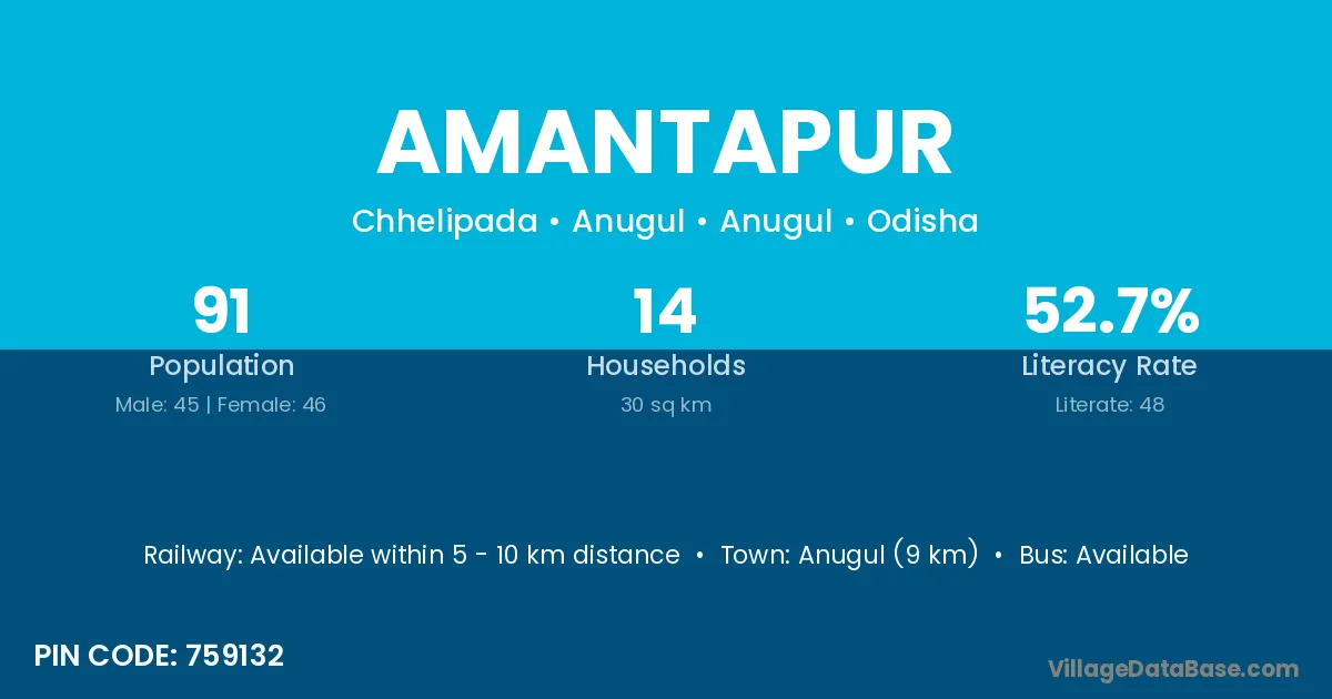 Anugul (18 km) is the nearest town to Amantapur village for major economic activities and is located approximately 18 km away.